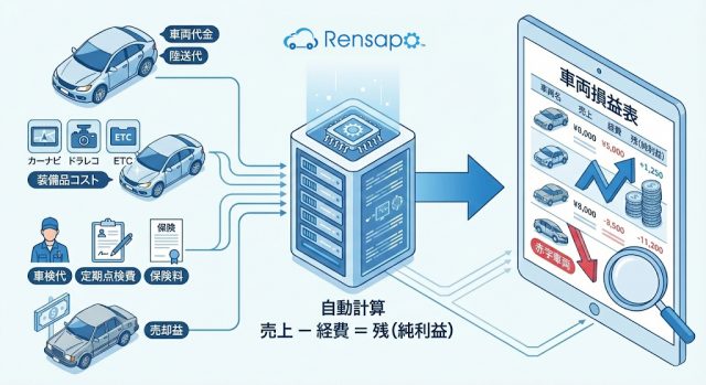 れんサポの「車両損益表」は、この中間の収支を自動で可視化し、入口から出口をつなぐことで「本当の利益」を明らかにするための機能です。